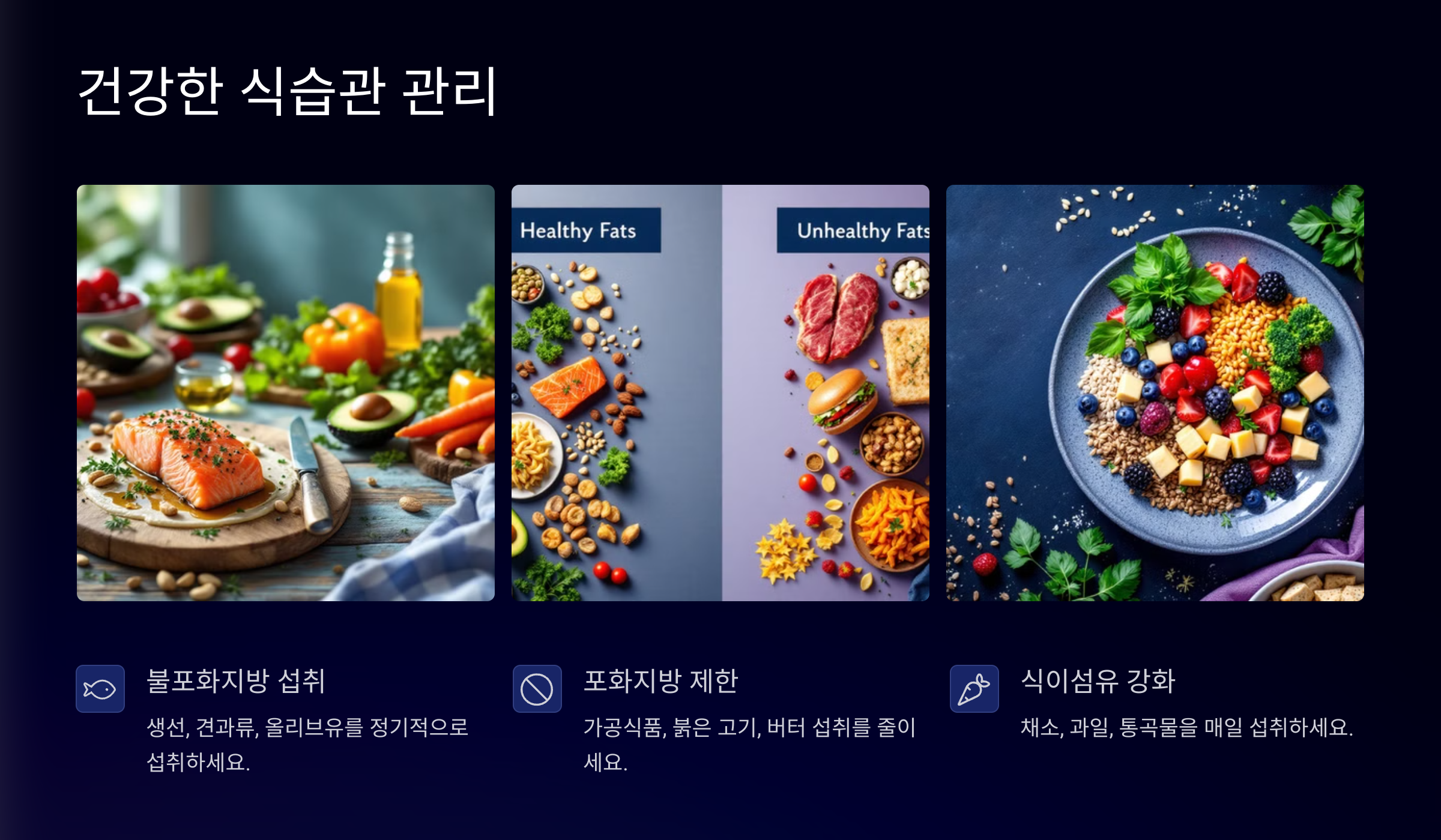 콜레스테롤 수치를 낮추기 위해 가장 중요한 건 식단 관리예요. 동물성 지방과 트랜스지방을 줄이고, 섬유질이 풍부한 식품을 늘리는 것이 핵심이에요.